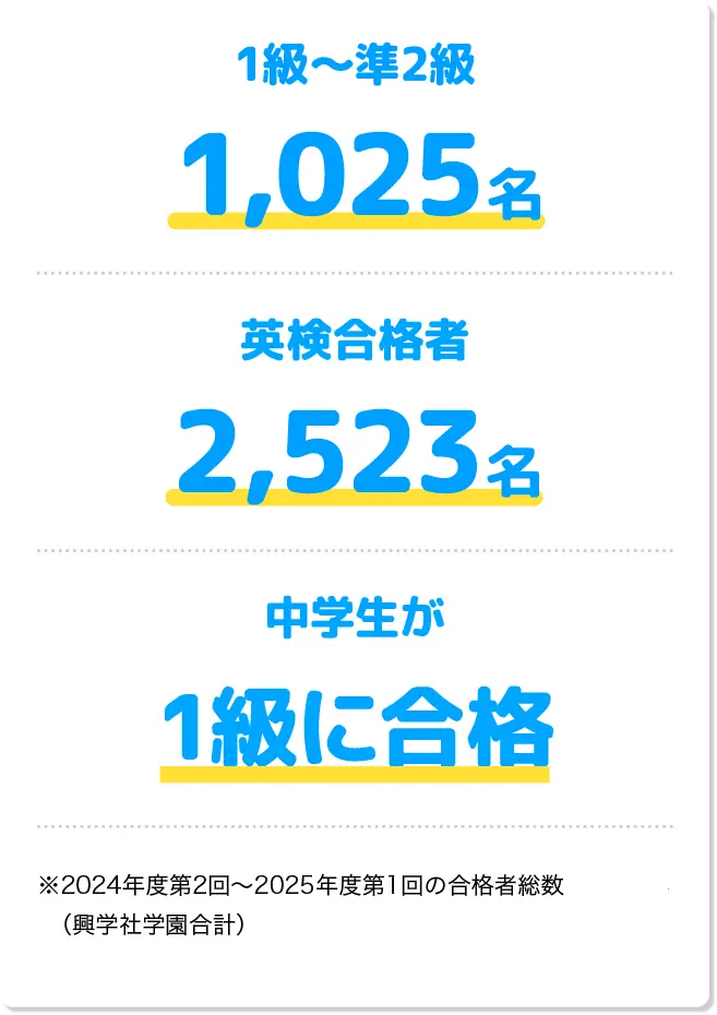 毎年、3,000名以上の合格実績を誇ります。1級から準2級の上位クラス多数の合格者がいます。さらに、中学生での1級合格者や小学生での準1級合格者も多数輩出しています。